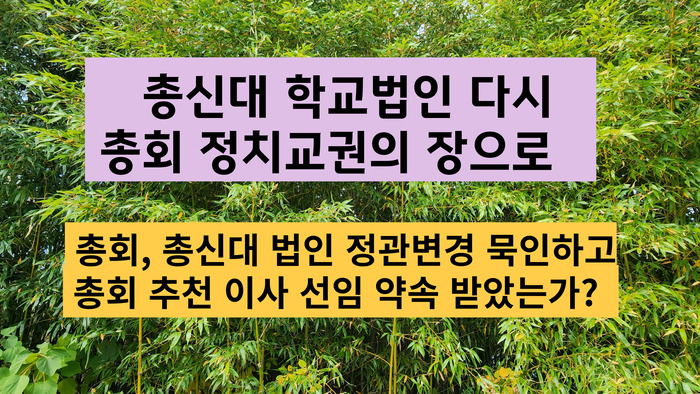 총신대 법인 정관변경 묵인하고 총회 추천 이사 약속받았나?정치권이 또 총신대에 기웃거리고 있다. 10년 동안 세월 동안 어떻게 평온을 찾은 총신인가? 그때 그들은 무엇을 했는가? 이제 다시 과거로 회귀한다면 총신대는 이제 총회가 버린 것이 될 것이다.